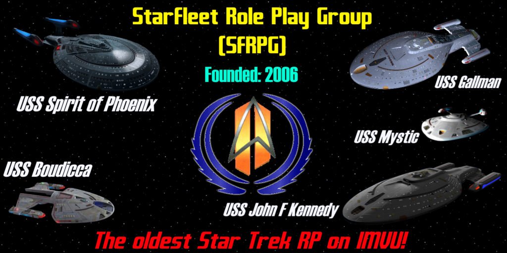SFRPG – Starfleet RolePlay Group; the oldest fleet on IMVU (since its precursors were the 7th Fleet and 9th Fleet, the two original fleets, who merged to become SFRPG) – SFRPG has a clear chain of command and good roleplays. SFPRG functions together as a family and while it may have its problems, it is still one of the better groups on IMVU.